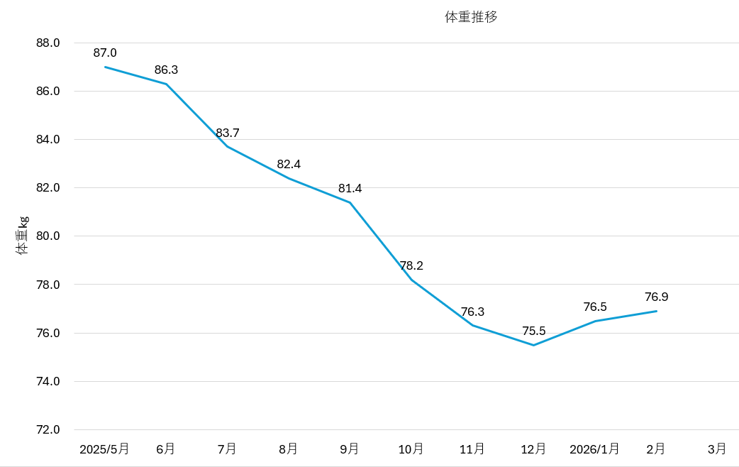 それはそうと正月におせち料理に大好きなお雑煮、餅…..を食べ続けた結果一月の体重はグラフを見て頂くと恐ろしい結果に終わっています。1月に食べ過ぎて”ヤバイ”と思いだし1月4日から新年のウォーキングを開始して頑張ったのですが残念ながら結果及ばず!散々な結果。。。